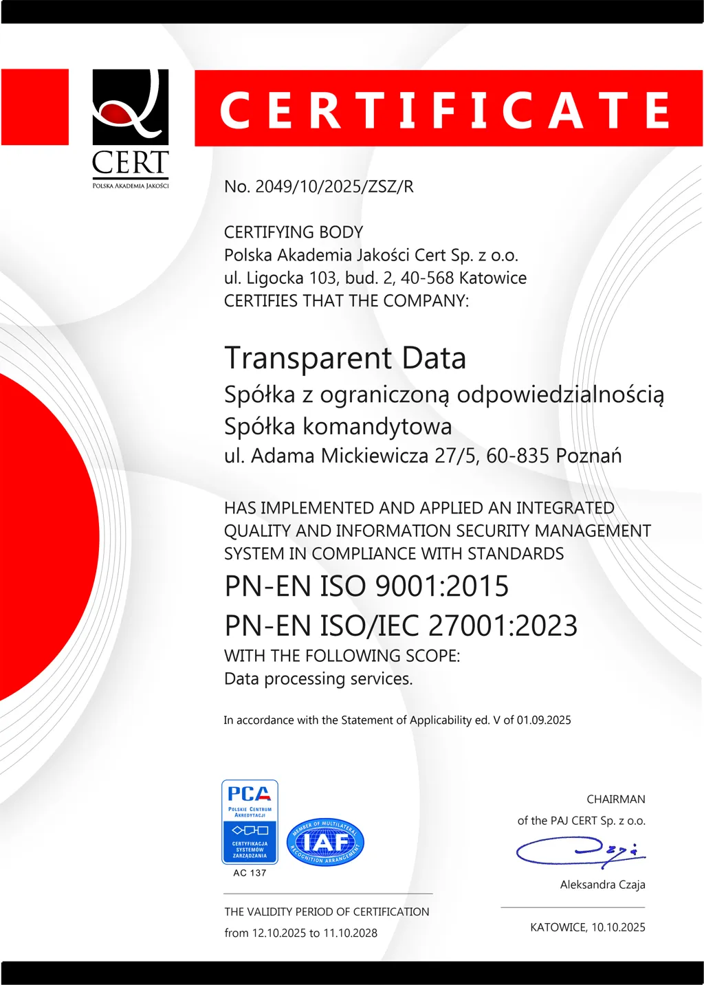 In addition to Transparent Data, Kaczmarski Group also includes, among others: the largest national economic information bureau KRD BIG S.A., Easycheck, ChronPESEL.pl, Kaczmarski Inkasso, Fakturatka.pl.